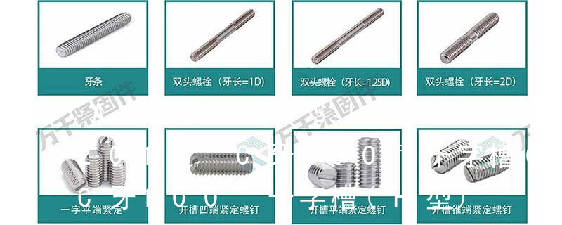 平杯)、半圓頭內六角螺釘(圓杯)、十字槽盤頭機螺釘、十字槽沉頭機螺釘、十字槽大扁頭機螺釘、十字槽盤頭自攻釘、十字槽沉頭自攻釘、十字槽大扁頭自攻釘、全牙絲桿(牙條)、六角螺母、法蘭螺母、尼龍螺母、蓋型螺母、蝶型
