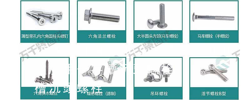 六角頭頭部帶孔螺栓 細牙 A 和 B 級 GB 32.3-88 下方頭螺栓 B級 GB 35-88 T 形槽用螺栓 GB 37-88 加強半圓頭方頸螺栓 GB /T794-93 活節螺栓 GB 798-88 地腳螺栓 GB 799-88 沉頭雙榫螺 GB 800-88 小 螺栓有:1、方頭螺栓,2、半圓頭方頸螺栓,3、十字槽盤頭螺釘,4、內六角沉頭螺釘,5、方螺母C級,6、蝶形螺母,7、六角頭螺栓,8、十字槽盤頭自攻螺釘。大小有M18、M6、M8、M16、M10、M12、M14、M20等型號。通常用