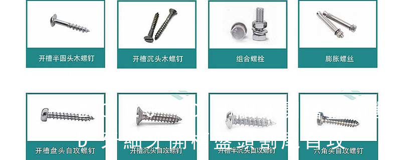 (鐵板牙自攻螺絲) B-2: Plastic Tapping Screw. (塑膠用,自攻螺絲) C: Wooden Screw : 木工螺絲 D: Drywall Screw :水泥墻螺絲 E: Self Drilling Screws鉆尾螺絲(不銹鋼鉆尾螺絲,復合材料鉆尾螺絲) F:膨脹螺絲,四片膨脹螺絲又